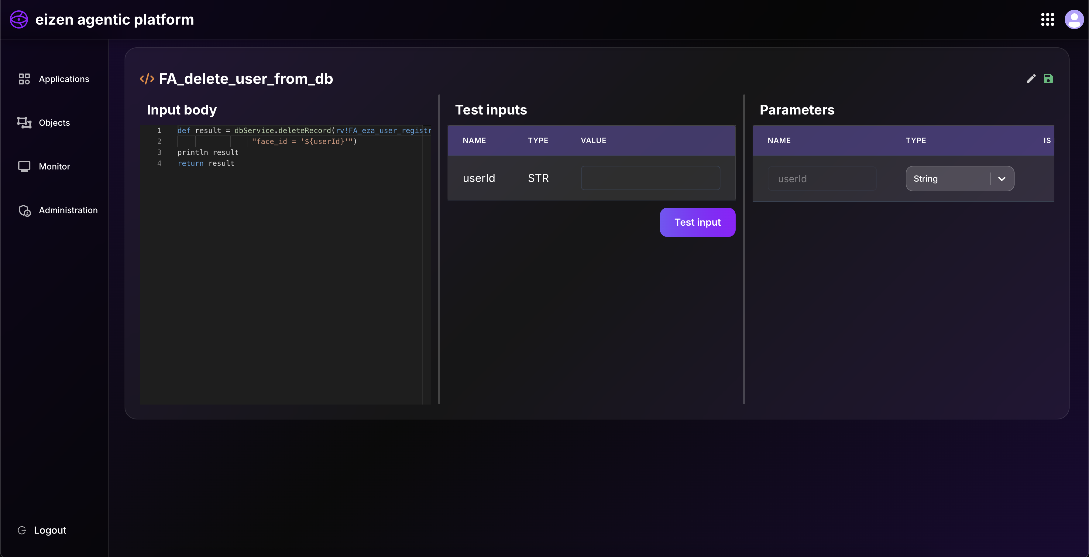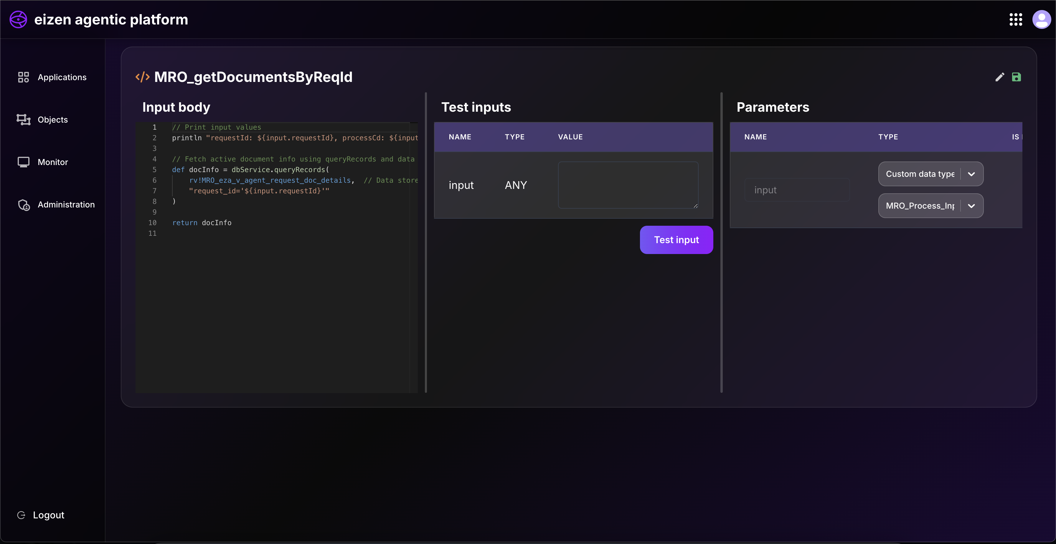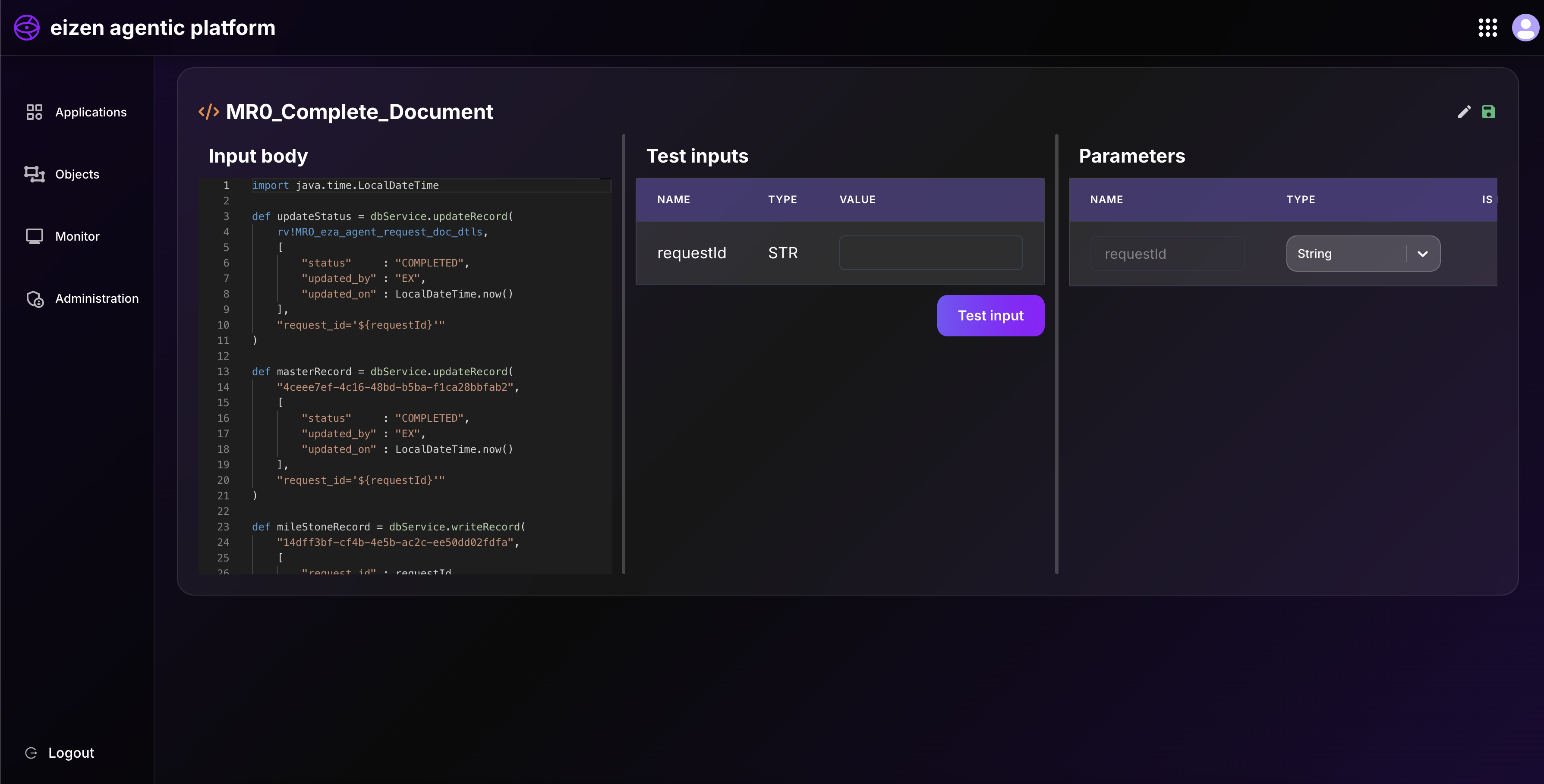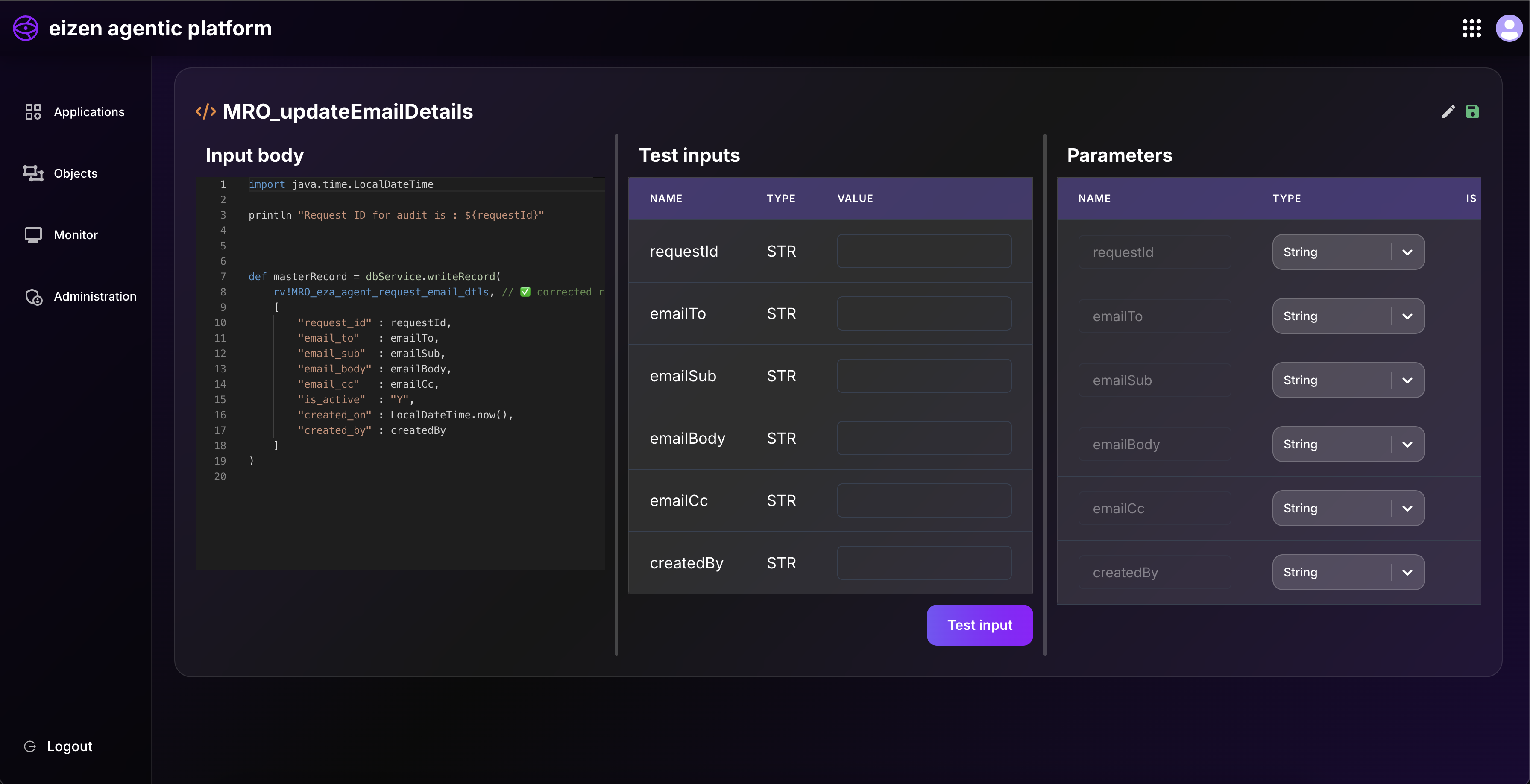 • On the right side, we define test input variables such as: